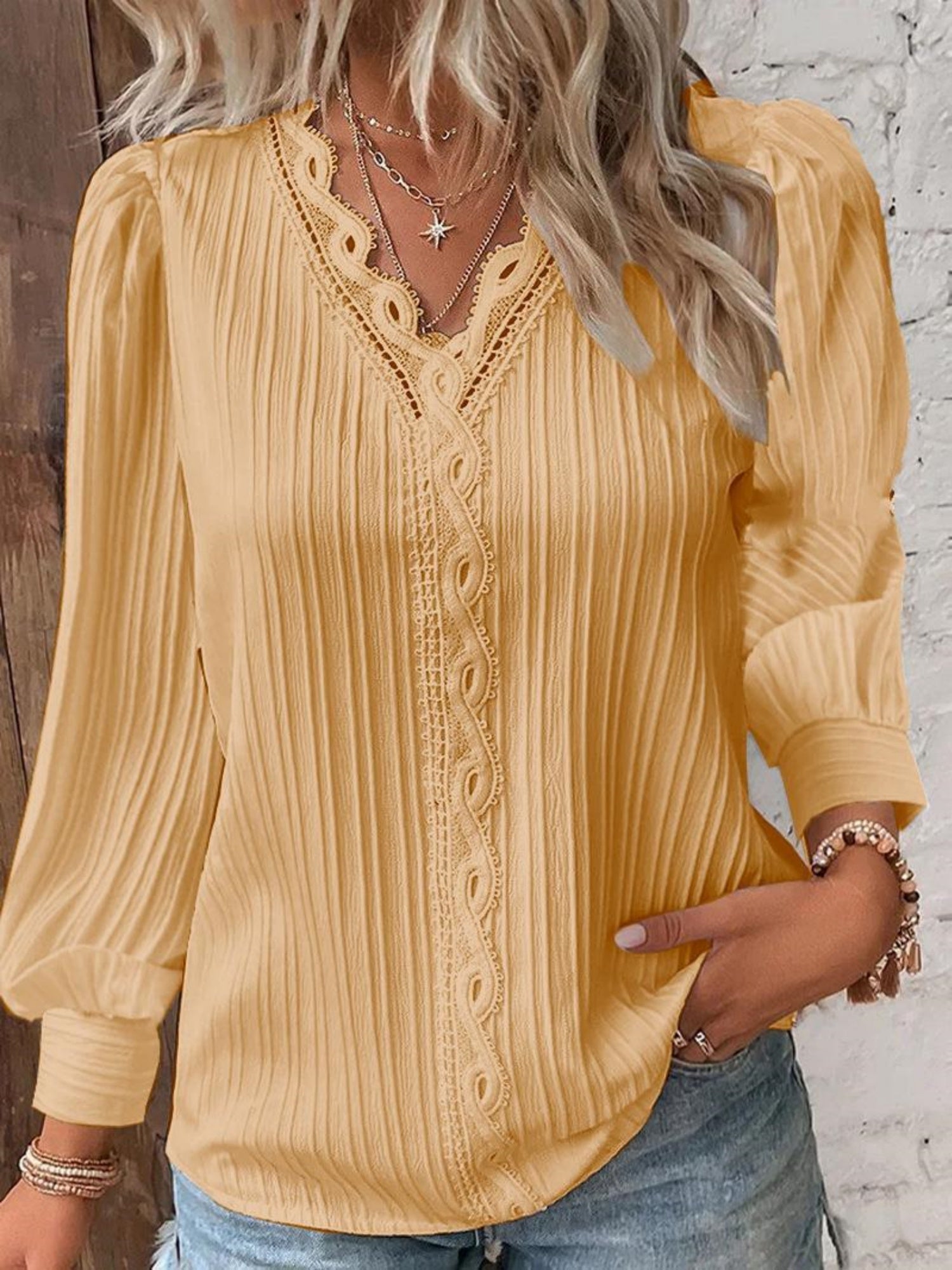 Lace Trim V-neck Long Sleeve Shirt T-shirts