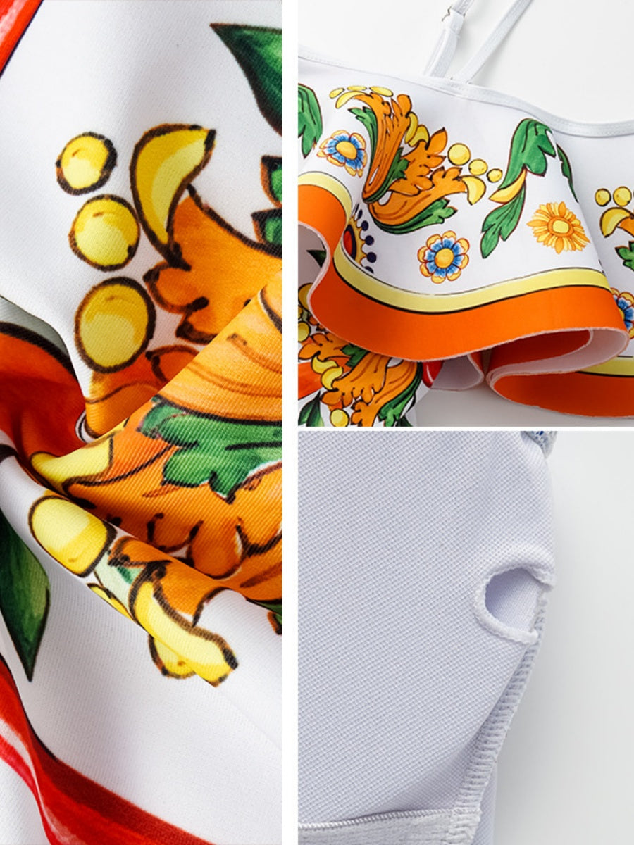 One-shoulder Ruffled Printed Swimsuit And Sun-protective Long Dress Two-piece Set
