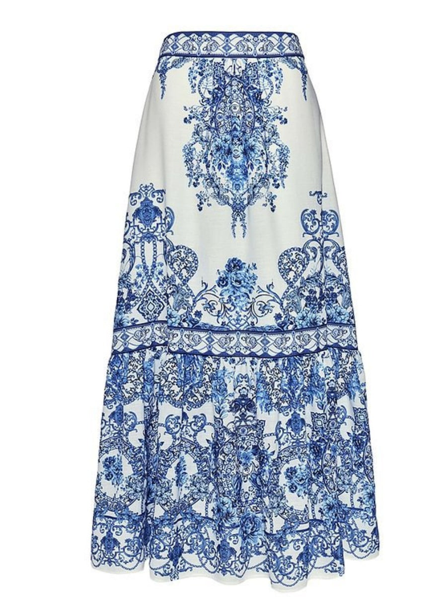 Blue And White Porcelain Print Bow Tie One-piece Swimsuit Sun Protection Long Dress Two-piece Set